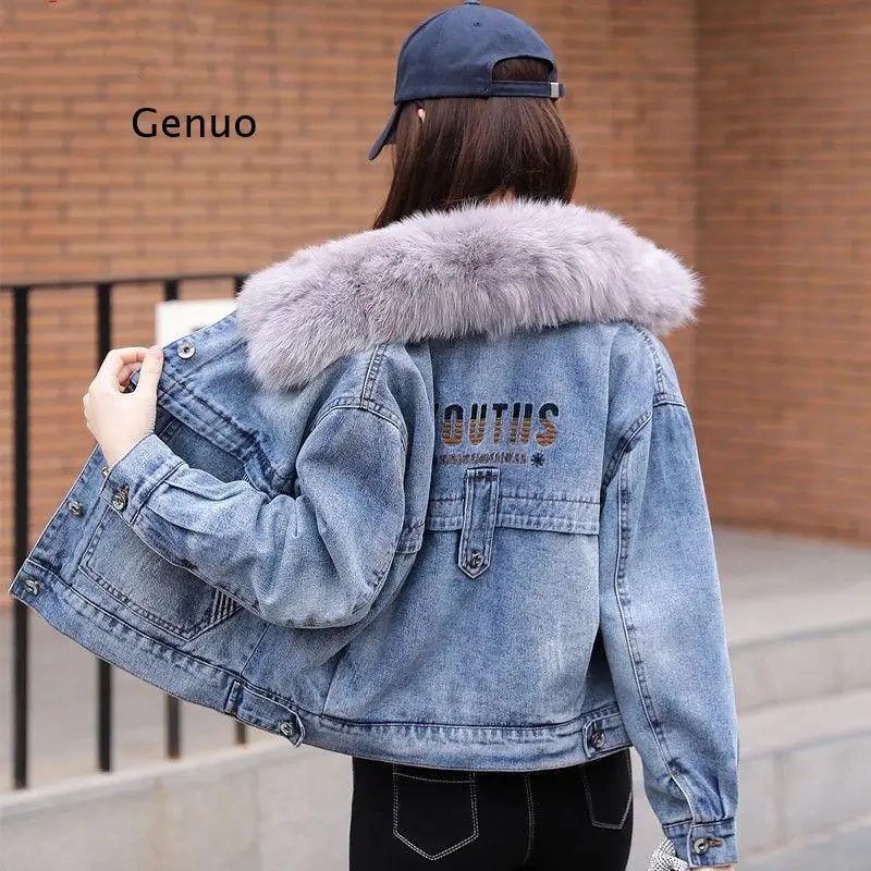 Chaqueta vaquera con cuello de piel sintética para mujer, abrigo informal holgado de lana bordada, estilo coreano, para invierno