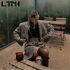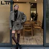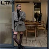 LTPH Conjunto de dos piezas de cuadros de pata de gallo para mujer, blazer recortado de cintura alta, falda ajustada a la cadera, Otoño, 2021