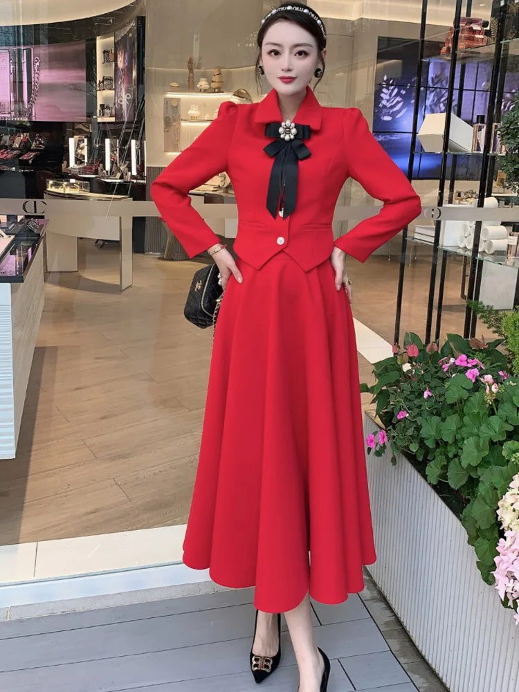Conjuntos de vestido de fiesta con lazo para mujer, Blazer elegante con falda larga, traje Formal de oficina de dos piezas, rojo, Primavera, 2022