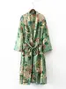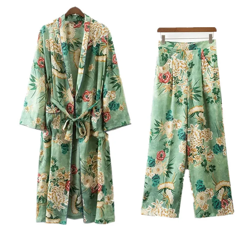 Conjunto de 2 piezas para mujer, traje femenino de moda, estilo informal, con estampado de flores, Kimono, chaqueta de pijama holgada + Pantalones