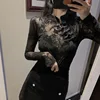 Chemisier brodé en dentelle florale pour femme, haut à manches longues, Slim, Transparent, noir, 108C