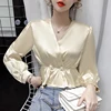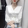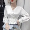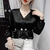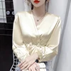 Chemisier coréen en soie pour femmes, col en v, chemise en Satin à manches longues, taille à perles, Tops en soie, grande taille