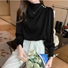 Chemisier en Satin bleu et blanc à manches bouffantes pour femmes, col montant avec boutons, chemise de bureau, nouvelle collection printemps été 2021, en Stock