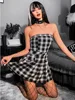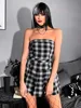 SRUBY – robe moulante à carreaux pour femme, tenue froncée Sexy, épaules dénudées, ceinture, taille haute, couture, boîte de nuit, automne 2021