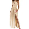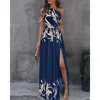 Robe longue fendue pour femmes, imprimé, épaules inclinées, sans manches, sexy