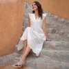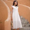 Robe longue en pur coton, Simple, décontractée, couleur unie, ajouré, Style vacances, taille haute, mode, mi mollet, été, nouvelle collection