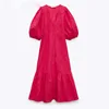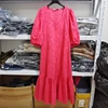 Robe longue en coton brodée pour femmes, décontractée, rouge, col en V, manches courtes, ajourée, été, 2021