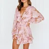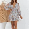Robe imprimée en mousseline de soie pour femmes, tenue courte, Sexy, col en V, avec nœud à nouer sur le devant, à volants, de forme trapèze, de fête, collection printemps 2021