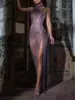 Robe de soirée sexy à paillettes, col licou, coupe cintrée, sans manches, élégante, fendue, pour femmes, vêtements de fête, nouvelle collection