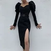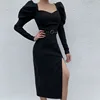 Robe noire moulante à manches longues bouffantes, jupe longue à col carré, Sexy, fendue, pour femmes, tenue de soirée