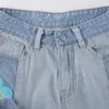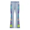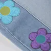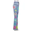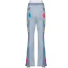 Jean taille haute en Denim bleu pour femme, pantalon évasé brodé de fleurs, taille haute, extensible, moulant, tissu 2021