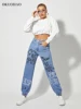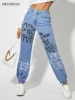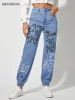 Pantalon de survêtement en Denim pour femmes, imprimé, droit, avec motif de lettres, taille haute, avec cordon de serrage