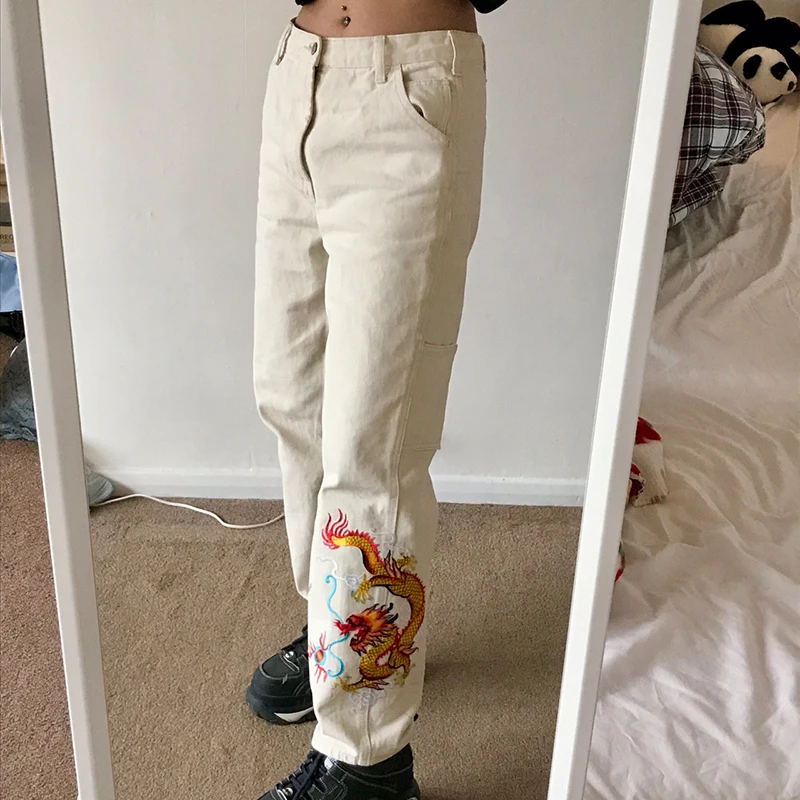 Jean brodé Dragon pour femmes, pantalon droit, Harajuku, décontracté, Hip Hop, esthétique, automne, taille haute