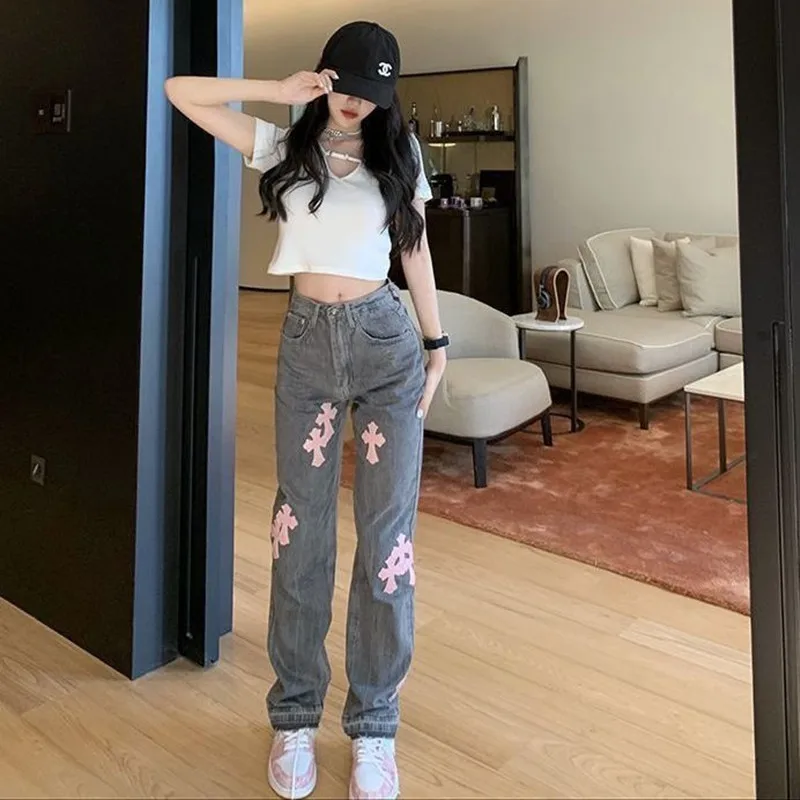 Pantalon en Denim gris pour femme, Streetwear, mode coréenne, taille haute, Baggy droit, polyvalent, décontracté