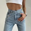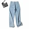 Pantalon en jean denim bleu pour femme, taille haute, ample, couleur unie, bouton, ceinture Oblique, rétro, fermeture éclair, automne