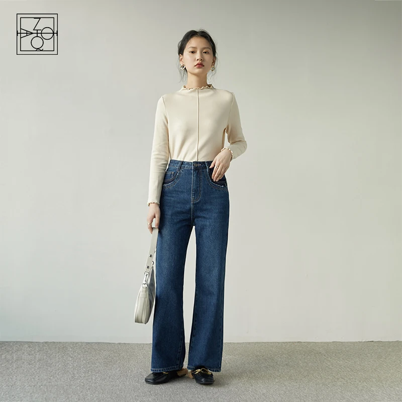 ZIQIAO – Jean à jambes droites taille haute en cachemire pour femmes, Jean fendu de couleur claire, bleu foncé rétro, nouvelle collection 2021