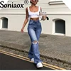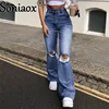 Jean déchiré à jambes larges pour femmes, coupe ample, taille haute, bleu délavé, Denim, coton, pantalon d'été, Baggy évasé, 2021