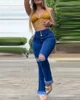 Jean déchiré bleu rétro pour femmes, pantalon évasé droit, taille haute, coupe effilochée, bouton à franges, nouvelle collection automne 2021