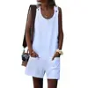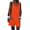 Combishort sans manches en coton et lin pour femme, couleur unie, barboteuse à boutons