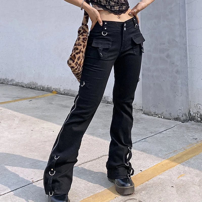 Emo Dark – pantalon gothique Y2K, Streetwear esthétique, cyber anneau en métal, Punk Rock Singer, pantalon Kpop, Slim, Harajuku, noir