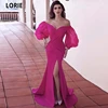 Robe De soirée en Satin Fuchsia, manches longues bouffantes, col en v, fente latérale, traîne, sirène, robes De bal