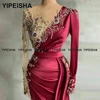 Yipeisha – robe de soirée en Satin rouge, col transparent, manches longues, asymétrique, robe de bal, sirène, sur mesure, arabie saoudite