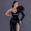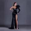 Robe De soirée noire en velours, asymétrique épaule dénudée, longue, Sexy, fente latérale haute, plumes, robe De bal De forme sirène, sur mesure