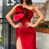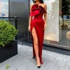 Robe De soirée longue en Satin rouge, asymétrique, sans bretelles, style sirène, fente latérale haute, sans manches, robes De bal personnalisées