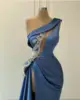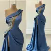 Robe de soirée en Satin bleu, asymétrique, épaule dénudée, fente latérale haute, perles, Robe de bal de forme sirène