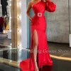 Robe asymétrique en Satin rouge, pour cérémonie De mariage, asymétrique, épaule dénudée, longueur au sol, fente latérale, grande taille, 2021
