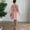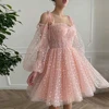 Robe De bal courte en dentelle rose pour filles, avec manches longues, bretelles Spaghetti, longueur aux genoux, Simple