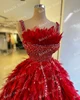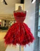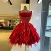 Robe de soirée courte de luxe pour femmes, rouge, sans manches, plumes, paillettes et perles, tenue de bal scintillante, sur mesure