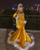 Robe de soirée de forme sirène pour femmes, tenue de bal élégante, de luxe, manches longues, plumes, grande taille, sur mesure, jaune or