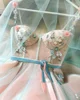 Robe de soirée de forme trapèze pour femmes, rose, bleu, élégante, bretelles Spaghetti, motif floral fait à la main, avec ceinture