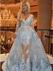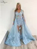 Robe de soirée sirène bleu ciel, avec traîne détachable, manches longues, Appliques de dentelle, Illusion d'organza, robes de bal, 2020