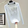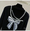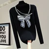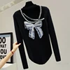 T shirt ajouré Sexy pour femmes, tricot avec perles, slim, extensible, Style coréen, paillettes, nœud amincissant, pull pour dames, printemps, 2022