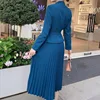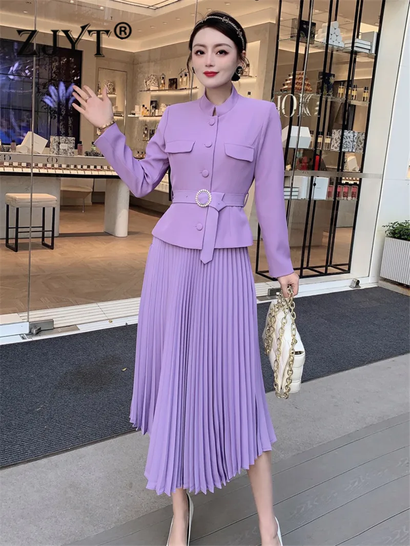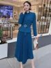 Tenue d'affaires élégante pour femmes, costume Blazer à col montant avec longue jupe plissée, ensemble deux pièces, bleu, printemps, 2022