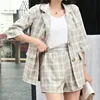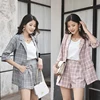 Veste à carreaux et pantalon pour femme, ensemble 2 pièces, short et haut, style décontracté coréen, tenue de bureau, couleur rose, tendance été 2020