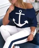 Ensemble 2 pièces pour femmes, survêtement imprimé ancre de bateau, haut court, short, pantalon, taille élastique, grande taille