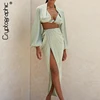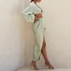 Ensemble cryptographique en Satin soyeux à manches longues pour femme, haut court et jupe, Sexy, deux pièces, mode, vert