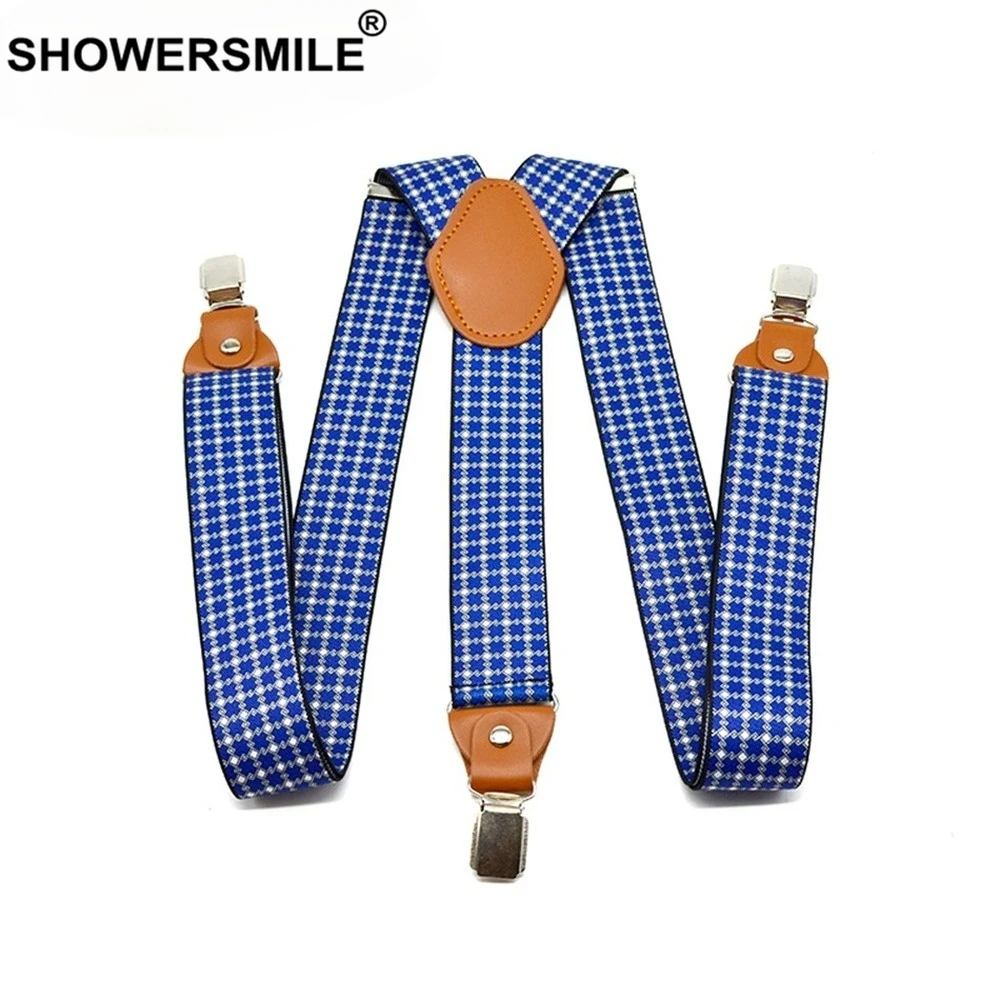 Ceinture de pantalon en cuir pour hommes, bretelles Business à carreaux bleu, large, ajustable, élastique à 3 Clips, 120cm x 3.5cm