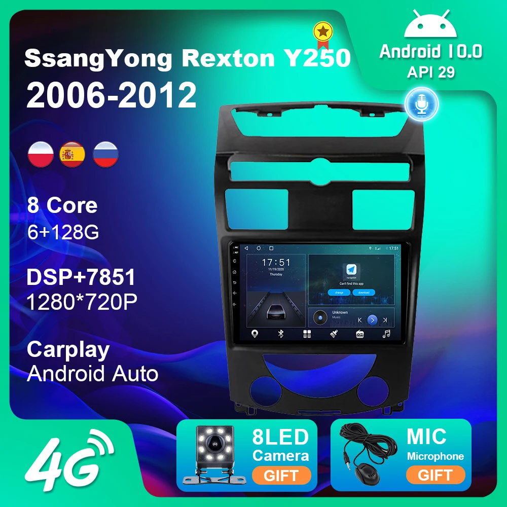 Sistema multimídia automotivo, reprodutor com android 10, rádio, 2 din, wi fi, 4g, navegação gps, para ssangyong rexton y250 ii 2002 2013