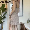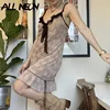 Allneon 90s estética bonito babados guarnição floral impressão chiffon vestidos y2k fairycore brown malha bandagem sem costas cami vestido doce