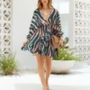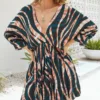 2021 outono nova cor listra impressão com decote em v gravata vestido de mangas compridas