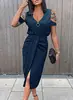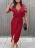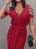 Ponto 2022 casual oco manga curta v neck cintura meados de comprimento vestido de cor sólida
