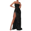 Moda feminina vestido de festa de um ombro cor sólida vestido longo de cintura alta alta fenda esfregar piso vestido