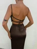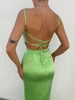 Cryptographic drapeado corte cetim midi vestido para mulheres clube de festa sem costas sem mangas espaguete cinta vestidos bandagem verão