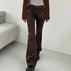 Brown sólida cintura baixa y2k denim jeans retalhos bolsos grunge queimado calças femininas vintage 90s sweatpants estéticos