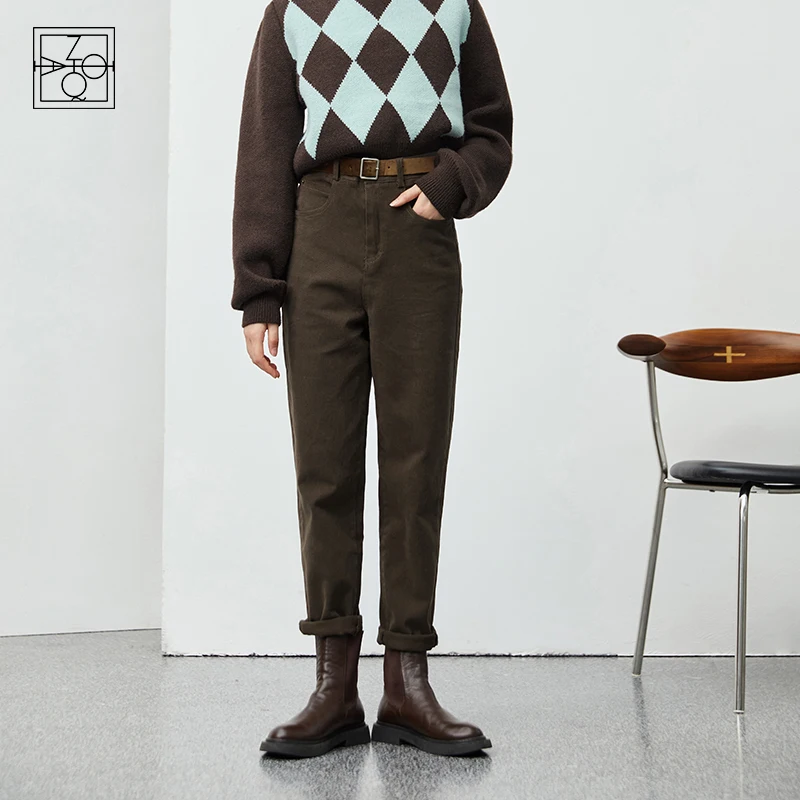 Ziqiao feminino inverno grosso café cor retro calças retas quadrado remendo bolso decoração algodão cintura alta calças de brim femininas