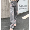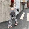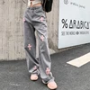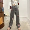 Wkfyy feminino causal rosa cruz remendo projetos cinza denim botões solto reta ampla perna calças jeans afligido j4014